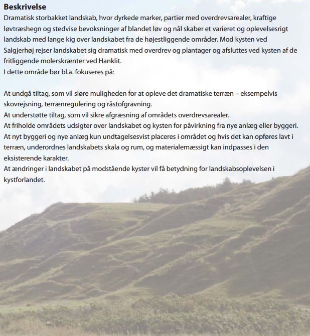 Landskabet ligger i umiddelbar forlængelse af og som en del af det samlede bakkekompleks, som i øst udgøres af det fredede ”Salgjerhøj” og ”Hanklit”.