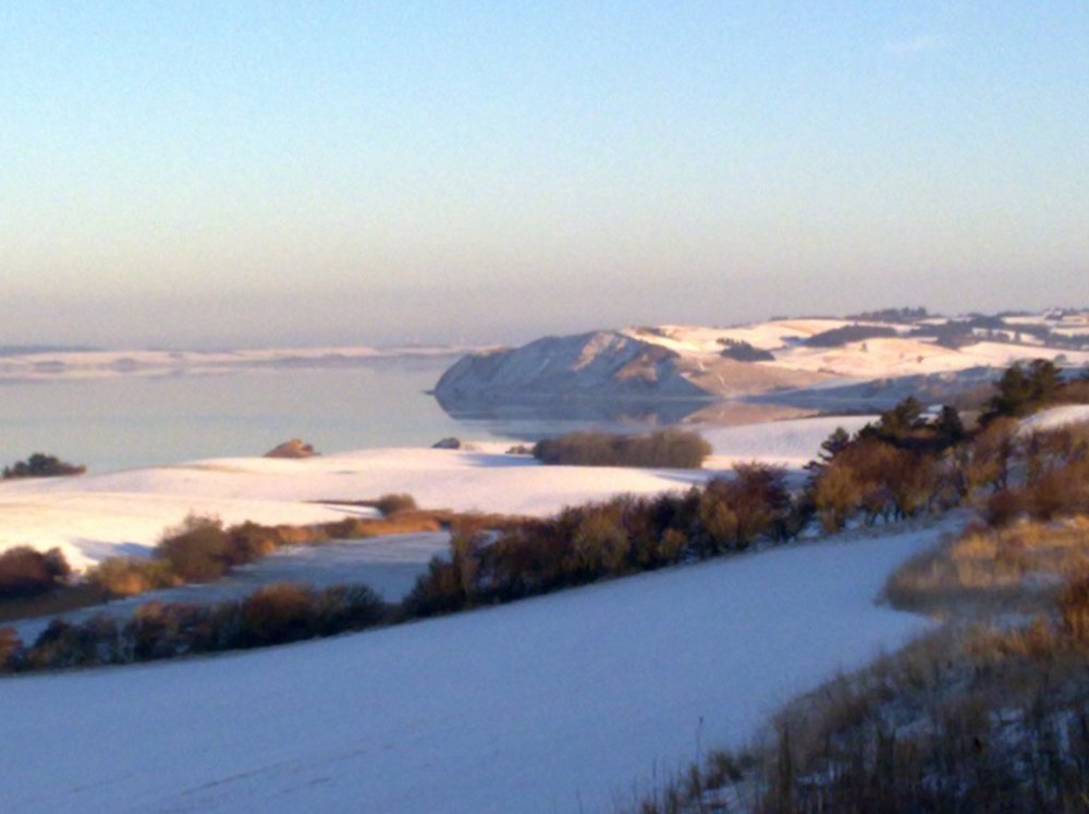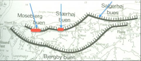 Udsigt fra Stærhøj mod Gullerup og Hanklit. Højden fornemmes tydeligt når man ser på læhegnet midt i billedet.